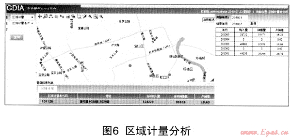 在GIS地理圖層上標(biāo)定區(qū)域流量計,通過GDIA系統(tǒng)將兩數(shù)據(jù)源的數(shù)據(jù)進(jìn)行整合,將《SCACA系統(tǒng)》流量計測點數(shù)與《客戶信息管理系統(tǒng)》中該區(qū)域用戶賬本信息配對綁定,清晰的反映抄表月份區(qū)域內(nèi)購入與實際銷售量的差異,高效地獲取區(qū)域產(chǎn)銷差的準(zhǔn)確數(shù)據(jù),擺脫以往手工摘錄事后拼揍的統(tǒng)計方式,為職能部門與管理者提供區(qū)域產(chǎn)銷差分析基礎(chǔ)數(shù)據(jù)(見圖6)。