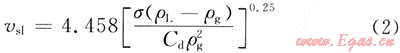 將式(2)帶入式(1),取Cd=0.44,忽略氣體密度的影響(ρg<<ρL),得到: