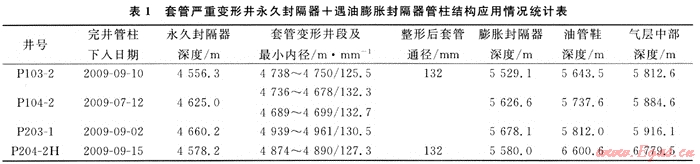 普光氣田套管變形井發(fā)生后,通過普光氣田主體嚴(yán)重套管變形井綜合修井技術(shù)研究,采用井下震擊整形技術(shù)、滾壓整形技術(shù)實(shí)現(xiàn)套管擴(kuò)徑,普光103-2、204-2H井整形后通徑達(dá)到132~134mm,保證小直徑遇油膨脹封隔器下井的要求;2009年7~9月份應(yīng)用外徑130mm遇油膨脹封隔器,采用“永久封隔器+遇油膨脹封隔器”采氣管柱結(jié)構(gòu),先后完成了普光103-2、104-2、203-1定向井、204-2H水平井投產(chǎn)作業(yè)施工,現(xiàn)場(chǎng)應(yīng)用效果較好(見表1),對(duì)高含硫嚴(yán)重套管變形井修井投產(chǎn)具有重要現(xiàn)實(shí)意義。