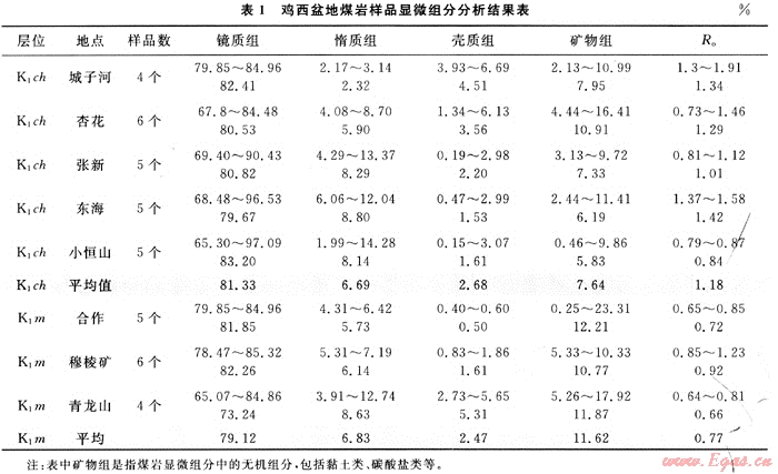 通常把煤中各種復(fù)雜的顯微有機(jī)組分按其性質(zhì)和成因劃歸3個(gè)組,即鏡質(zhì)組、殼質(zhì)組和惰質(zhì)組,以鏡質(zhì)組為主的腐殖煤形成的干酪根為腐殖型干酪根,通常是主要的生氣成分[2]。對(duì)雞西盆地8個(gè)礦區(qū)共40個(gè)樣本進(jìn)行煤巖顯微組分分析(分析結(jié)果見(jiàn)表1),殼質(zhì)組含量很低,城子河組范圍值為0.15%~6.69%,均值為2.68%;穆棱組范圍值為0.40%~5.65%,平均值為2.47%;鏡質(zhì)組含量普遍大于70%,城子河組平均值為81.33%,穆棱組平均值為79.12%,所以煤層不具備生油的物質(zhì)基礎(chǔ)但具備良好的生氣條件。鏡質(zhì)組反射率(Ro)是確定有機(jī)質(zhì)成熟度的重要指標(biāo)。城子河組煤巖樣本鏡質(zhì)體反射率的范圍為0.65%~1.91%之間,平均為1.18%,基本屬于肥、焦煤階段,穆棱組鏡質(zhì)體反射率的范圍為0.64%~1.23%之間,平均為0.77%,基本屬于氣、肥煤階段。兩個(gè)組有機(jī)質(zhì)演化均達(dá)到“低-中成熟”階段,處于“石油窗”內(nèi),可以大量生氣。
