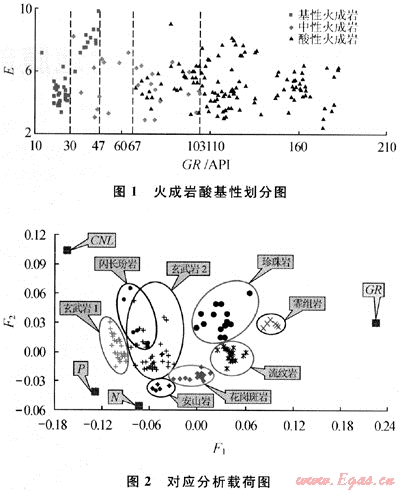 為了避免載荷圖上數(shù)據(jù)點(diǎn)過(guò)多影響對(duì)應(yīng)分析,首先得從樣本中挑選一些典型的、易于歸位的樣品用于對(duì)應(yīng)分析研究。利用對(duì)應(yīng)分析發(fā)現(xiàn)GR對(duì)研究區(qū)的火成巖巖性反應(yīng)最為敏感,圖1為利用GR對(duì)研究區(qū)火成巖酸基性的劃分,從另外一個(gè)角度驗(yàn)證了對(duì)應(yīng)分析的正確性。CNL、P與N對(duì)研究區(qū)的巖性反應(yīng)次之。