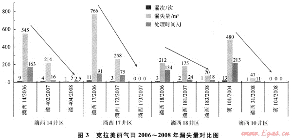 通過防漏、堵漏技術的應用及方案的有效實施,防漏、堵漏工作取得了明顯效果(圖3),2007~2008年上鉆的滴西20、滴西21、滴西22、滴西171、滴西172、滴西173、滴西181、滴西182、滴西183、滴402、滴404、滴103、滴104、滴西25、滴西31井等井發(fā)生井漏的次數、漏失量及處理井漏耗費時間均大幅度減少。