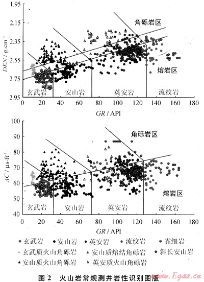 2) 建立火山巖地球物理測井響應特征。首先完成了123塊樣品的全巖氧化物含量(特別是重礦物元素MnO、Fe203、TiO2等)和放射性元素(U、Th、K)含量分析,以針對性的實際資料證實了從基性到酸性火山巖U、Th、K的含量逐漸增大、放射性逐步增強以及重礦物含量逐漸減少的規(guī)律。然后以取心井為基礎,用標準火山巖巖心標定到測井曲線上,確定了不同巖性火山巖的典型測井響應特征,強化了由基性巖到酸性巖自然伽馬值升高、密度降低、聲波時差值升高的基本規(guī)律。