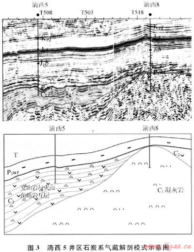 2006年通過井震結(jié)合對滴西5井區(qū)進行了解剖,從巖性巖相變化模式確定滴西5和滴西8井區(qū)石炭系為不同的巖相巖體,認為滴西5井以火山角礫巖為儲層,以安山巖為隔層,氣藏類型為受火山巖(角礫巖)巖性控制的層狀地層氣藏,而不是以前認識的構造氣藏(圖3)。