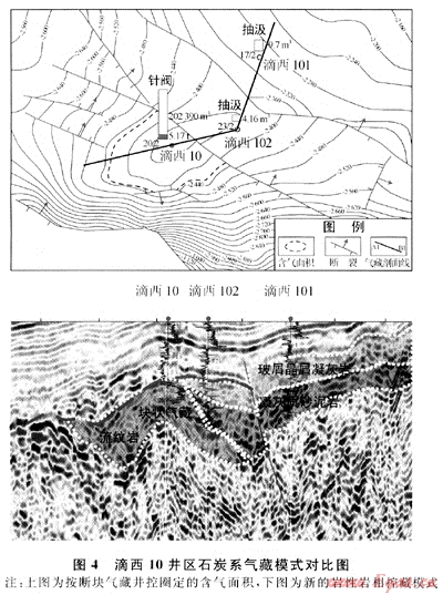 2) 滴西10井區(qū)。滴西10井鉆于2003年,石炭系巖性為流紋巖,2004年在石炭系試氣2層均獲得高產(chǎn)工業(yè)氣流。按照頂面構造控藏模式,2004、2005年分別鉆探滴101井和滴102井2口評價井,石炭系巖性均為凝灰?guī)r,無油氣顯示。2005年底,按斷鼻構造氣藏圈定滴西10井井控面積4.74km2(圖4中的上圖),探明天然氣地質(zhì)儲量20.20×108m3。2006年,對滴西10井區(qū)按巖性圈閉模式進行了重新解釋,提出了新的氣藏模式(圖4中的下圖),并對滴102井進行了加深鉆探以驗證新模式。滴102井于3310m開始加深,3460m完鉆,至3340~3370m井段鉆遇流紋巖與滴西10井出氣段巖性一致。鉆探結(jié)果證實了新模式的正確性,指導了后續(xù)探井的部署。2008年,按照巖性巖相控藏模式,鉆探了滴103井和滴104井,均獲得成功,新增含氣面積13.57km2,新增探明天然氣地質(zhì)儲量83.07×108m3。
