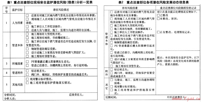通過確定監(jiān)護目標并以此為前提實施風險識別,同時,對風險識別的結果做跟蹤監(jiān)控,根據監(jiān)護目標在施工過程中出現的變化調整監(jiān)控措施,隨時關注第三方施工工地區(qū)域內影響燃氣管道安全運行的危險因素,并且適時采取措施予以控制;將項目目標動態(tài)控制原理應用在城鎮(zhèn)地下燃氣管線巡查中,能切實提高現場安全監(jiān)護效率。