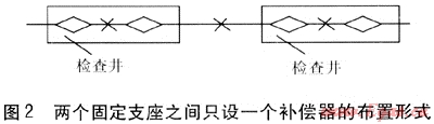 造成這種情況的原因較為復雜:一是補償器自身質量偏差較大,雖型號規(guī)格相同但剛度差距大,無法自由伸縮;二是受管材加工制作質量與安裝質量影響,無法自由伸縮,駐點兩側管道受力不均,造成駐點偏移大,駐點不固定,使波紋管補償器無法承受,最終造成破壞。除非對補償器自身作較大改進,保證波紋間均布限位使波紋管補償器剛度均衡趨于一致,否則采用普通補償器條件下,還應按照每兩個固定支座之間只設一個補償器的原則進行布置(見圖2)。