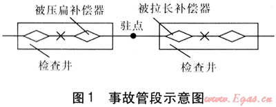 在直埋管道管系中,為減少固定支座的數(shù)量,往往布置成“駐點”形式。直埋管道兩個規(guī)格型號相同的相鄰補償器之間管道中點不設固定點,當管道受熱均勻膨脹時,在兩個補償器中間必然形成一個力的相對平衡點,即駐點。理論上以該點為界,管道向左右兩個方向均勻膨脹,一般認為,力的平衡點會因管道受力不均勻而發(fā)生少許偏移,一般按20%余量進行考慮。筆者認為,這種布置方式值得商榷。武威市城南集中供熱有限責任公司有一段直埋管道(Ø630×10)采用這種布置方式,固定支座之間距離為206m,兩只補償器規(guī)格型號完全相同,補償量均為150mm。在2008年熱網運行中,其同側兩個補償器相繼發(fā)生故障,拆解后發(fā)現(xiàn),一個補償器已被壓扁,壓縮量200mm,另一個不僅未起到補償壓縮作用,反而被拉長50mm,一個補償器伸長對另一個補償器造成過度壓縮,從而使兩個補償器均發(fā)生破壞失效,事故管段示意圖見圖1。