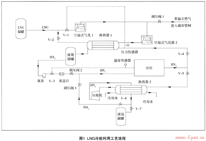 在本方案中,通過換熱器中氨氣的壓力確定進入換熱器的LNG流量;通過冷庫溫度調(diào)節(jié)進入冷庫的液氨量;再通過低溫液氨流量確定冷能費用。