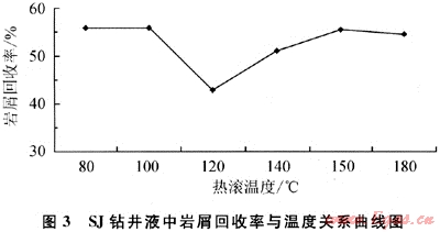 由同2.1.2老化后的鉆井液過(guò)40目濕篩后所得巖屑一次回收率,考察溫度對(duì)SJ鉆井液中巖屑回收率的影響,即考察溫度對(duì)SJ鉆井液的抑制性的影響。