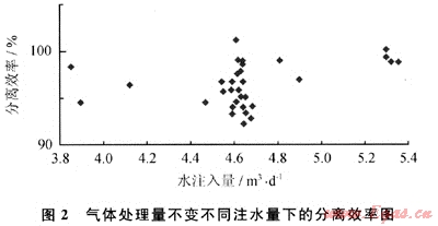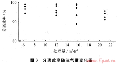 2) 當注氣量增加時,分離效率略有降低,但分離效率基本在90%以上(圖3)。