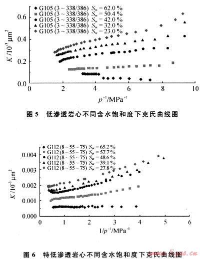 圖5是滲透率為0.3×10-3μm2的低滲透巖心在不同含水飽和度下(62%~23%)克氏曲線的分布規(guī)律??梢钥吹疆?dāng)含水飽和度大于60%時(shí),氣體的克氏曲線特征表現(xiàn)為液相滲流的特征,即隨驅(qū)替壓力增加,巖心滲透率有減小的趨勢(shì),曲線的斷點(diǎn)是由于高含水飽和度下,含水飽和度難以控制、變化較大的結(jié)果;當(dāng)含水飽和度降到50%時(shí),克氏曲線變化幅度很小,整個(gè)滲流過(guò)程中滲透率幾乎不發(fā)生變化;當(dāng)含水飽和度降到40%左右,氣體滲流的克氏曲線開(kāi)始表現(xiàn)出不含水的單相氣體滲流特征,滲透率隨平均壓力降低而增加,開(kāi)始表現(xiàn)出滑脫效應(yīng);當(dāng)含水飽和度降低到30%左右時(shí),氣體滲流過(guò)程中的滑脫效應(yīng)更加明顯;當(dāng)含水飽和度降到20%左右時(shí),氣體滲流的克氏曲線接近于不含水的單相氣體滲流特征,而且在低壓下出現(xiàn)強(qiáng)滑脫現(xiàn)象,高壓下還表現(xiàn)出了高速非達(dá)西流效應(yīng),而且隨含水飽和度增加,啟動(dòng)壓力梯度增大,高速非達(dá)西流效應(yīng)減弱,但是其滲流特征與不含水單相氣體的滲流特征已經(jīng)非常相近。
