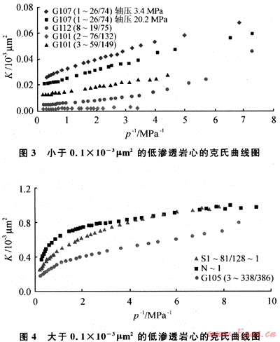 從上面的表達(dá)式可以看出,同一巖石的氣測(cè)滲透率值大于液測(cè)滲透率;平均壓力越小,氣測(cè)滲透率Kg越大;同一巖石不同氣體所測(cè)的滲透率也不同;巖石越致密,孔道半徑越小,滑脫因子(6)越大,滑脫現(xiàn)象越嚴(yán)重。