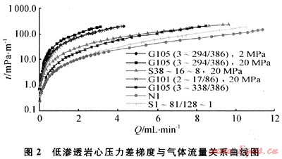 但是就低滲透氣藏氣體滲流的過(guò)程中是否存在啟動(dòng)壓力梯度這一問(wèn)題,國(guó)內(nèi)外的油氣田開(kāi)發(fā)工作者們還存在很大爭(zhēng)議。為此,對(duì)低滲透氣藏氣體滲流是否存在啟動(dòng)壓力梯度進(jìn)行了室內(nèi)測(cè)試,其測(cè)試結(jié)果見(jiàn)圖2。