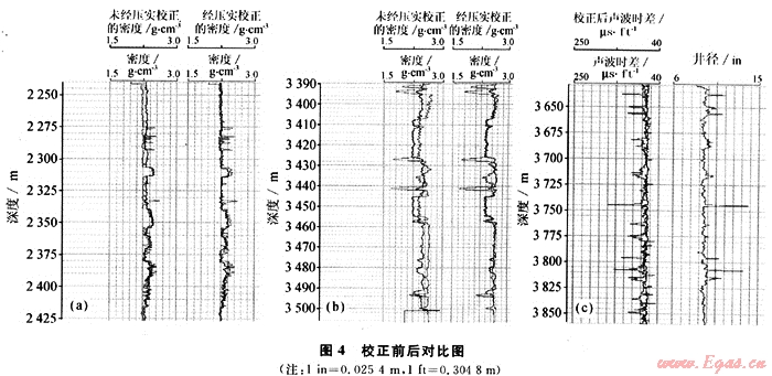 應(yīng)用上式,依據(jù)各井校正后的密度曲線求取了聲波時差,從圖4-c中可以看出,在井徑不變處,校正后得到的聲波時差與原始聲波時差吻合較好,而井徑變化導(dǎo)致聲波時差增大之處,也取得了較好的校正效果。