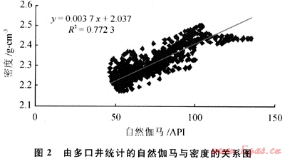 對未擴徑處的自然伽馬與密度進行相關(guān)分析,根據(jù)圖2的關(guān)系式,通過自然伽馬求取密度值。