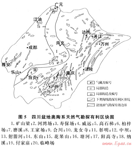 該區(qū)塊位于盆地中、西部,由廣元經(jīng)南充-樂山,向東呈鼻狀突出,面積約2.4×104km2(圖5)。從古地質(zhì)圖上可明顯看出,該區(qū)經(jīng)加里東期后的強烈剝蝕,下奧陶統(tǒng)已全面暴露地表,下奧陶統(tǒng)沉積時為碳酸鹽相向上變?yōu)樗樾紟r相,其底部常為碳酸鹽巖,經(jīng)鉆探證實女基井南津關組尚殘存有厚39m最容易溶蝕的生物灰?guī)r及鮞?;?guī)r,磨深1井和高科1井殘厚也分別達54.5m及22m,它們在長期遭受淡水溶蝕的情況下,必然會形成眾多古巖溶縫、洞。當其被上覆的中二疊統(tǒng)棲霞組泥頁巖及致密灰?guī)r封蓋后,皆可成為良好的儲層。除已知局部構(gòu)造外,若區(qū)內(nèi)在古地形上,奧陶系儲層有殘丘或隆起,均可能是氣聚集的良好場所。甚至,由于古巖溶縫、洞的形成,并不受構(gòu)造和地域的限制,即使向斜內(nèi)如瀘州地區(qū)云錦向斜的云錦7井和云錦8井,在鉆入中二疊統(tǒng)茅口組儲層均有鉆具放空顯示,并獲得工業(yè)氣流,這就進一步提示我們在勘探奧陶系儲層時,不僅要注重背斜圈閉,在一定條件下還要從非背斜油氣藏的角度去考慮,這將更會有益于勘探。本區(qū)塊的局部構(gòu)造,有礦山梁、河灣場、龍女寺、磨溪以及高石梯等10余個構(gòu)造,可供勘探。尤其是本區(qū)塊北段,靠近天井山古隆起一帶,如前所述已發(fā)現(xiàn)較多巨型瀝青脈,這在全國來說也是罕見,經(jīng)淺井鉆探,于200m以下還有液態(tài)原油,也許該區(qū)地腹還可能有下寒武統(tǒng)九老洞組油藏存在。因此對該區(qū)奧陶系來說,最現(xiàn)實的是廣元河灣場構(gòu)造河深1井已發(fā)現(xiàn)工業(yè)氣流,與其相鄰的一些構(gòu)造也可能有奧陶系氣藏存在,值得重視。