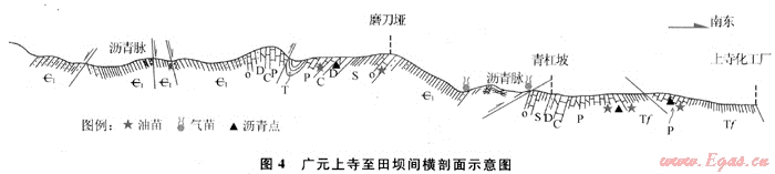 不難看出,該古隆起經(jīng)云貴、冶里和志留紀末的加里東運動,遭強烈剝蝕,從隆起核部向四周已露出了下寒武統(tǒng)九老洞組-奧陶系巖層,部分還殘留了少量志留系泥頁巖,其后于其上相繼沉積了泥盆系、石炭系及其以上地層。盡管從全盆地來看,燈影組和九老洞組烴源巖于志留紀時(也可能是志留紀末,因田壩田1井于九老洞組曾返出原油)已達到生油高峰期,然而對天井山古隆起來說卻是例外,因其上覆的巖層已遭到嚴重剝蝕,地溫已大幅下降,其后繼續(xù)生成的石油,至少至三疊紀地溫才能再次達到生油主峰期,而早期生成的油氣一部分已從剝露出來的寒武系-奧陶系巖層中散去。由于上覆巖一般皆很致密,晚期生成的油氣雖于三疊紀已達到生油高峰期,但生成的油氣可能僅有一部分已運移入奧陶系、二疊系及三疊系的碳酸鹽巖古巖溶縫、洞和沉積原生孔隙中,但絕大部分的油氣仍滯留于生油母巖中,并可能于新生代時才開始進入成氣階段,使石油裂解為天然氣,而在其尚未完全裂解為氣時,喜馬拉雅山造山運動便發(fā)生了,油氣伴隨斷褶全面向上運移,但遇阻后仍有不少滯留于斷帶和九老洞組裂縫中,如圖4和表4、5中所見。目前所見到的瀝青脈應是喜山期后,經(jīng)過漫長地質(zhì)歲月的剝蝕后,裸露出來并遭強烈氧化變成的硬性固體瀝青。這已于1967年在田壩從九老洞組向下曾鉆田1井,于井深134.8m放空0.10m,井深220m、333~335.5m,曾先后返出原油2kg及30kg,井口有潮涌現(xiàn)象,得到了證實。