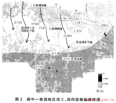 在層序地層學(xué)理論指導(dǎo)下,借鑒鄰區(qū)廣安氣田工業(yè)產(chǎn)氣井在須家河組四段的地震響應(yīng)特征[6],參考須家河組二段地震響應(yīng)特征的分析,依據(jù)有利儲層發(fā)育的層序地層模式分析可以得出結(jié)論:橫向?yàn)榍鹦蔚卣鹣?,縱向上為斜交前積反射并伴有頂積層反射,通常是有利儲層發(fā)育帶。依據(jù)以上儲層識別模式,結(jié)合閬中-南部地區(qū)地震剖面特征,通過各種屬性提取篩選分析,利用須三、四段儲層振幅特征可以很好地刻畫出本區(qū)沉積相分布特征(圖2)。預(yù)測結(jié)果表明,閬中-南部地區(qū)須三、四段物緣區(qū)主要位于北部,發(fā)育三角洲前緣-水下扇沉積體系,其中主要發(fā)育鳳嗚場-天宮院和馮家灣-春天觀2個水系所組成的三角洲前緣-水下扇沉積體系,有利的儲層發(fā)育帶是水下扇沉積。