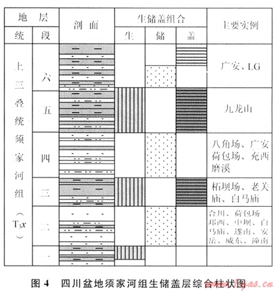 四川盆地上三疊統(tǒng)須家河組是在中三疊世雷口坡期侵蝕面基礎上沉積的典型陸相煤系碎屑巖沉積,縱向上一般可細分為6個巖性段(圖1),其中,須一、須三、須五段以泥巖、頁巖為主夾薄層粉砂巖、碳質頁巖和煤線,為湖泊沼澤環(huán)境沉積的產(chǎn)物,形成的煤系烴源巖大面積分布;須二、須四、須六段以大型三角洲沉積的灰色、細-中砂巖為主,形成的水下分流河道砂體大面積分布。生、儲層的交互發(fā)育構成了須家河組“三明治”結構的良好空間配置關系(圖4),有利于大面積成藏,提高了聚集效率。