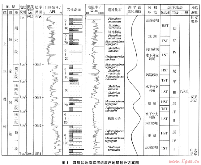 綜合地震、測井、鉆井和野外露頭資料,將須家河組劃分為4個三級層序,每個層序可進一步識別出低位、水進和高位3個體系域。層序Ⅰ對應于須家河組一段(須一段),層序Ⅱ對應于須二段和須三段,層序Ⅲ對應于須四段和須五段,層序Ⅳ對應于須六段(圖1)。