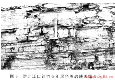 研究區(qū)下寒武統(tǒng)黑色頁巖主要發(fā)育于川南、黔北及黔東北-湘鄂西一帶,均以濱海沼澤及淺水缺氧停滯濱淺海沉積為主,與最大海泛面相對應(yīng)的低能黑色頁巖(包括碳質(zhì)頁巖和硅質(zhì)頁巖)相吻合,為克拉通基底盆地內(nèi)的第一套區(qū)域性烴源巖(屬于腐泥型有機質(zhì)類型,見表1),現(xiàn)今埋深在2000~4000m之間(圖4),總有機碳含量平均為2.74%[20]。其中,張家界實測總有機碳含量平均為7.7[21],Ro值平均為3.16%,處于高過成熟階段[22]。在野外實測剖面和井下巖心觀察中均發(fā)現(xiàn)了十分發(fā)育的裂縫(圖5),經(jīng)對研究區(qū)內(nèi)的老井進(jìn)行復(fù)查(威5、威18等井),已在該套頁巖中發(fā)現(xiàn)普遍存在的氣顯異常[23、24]。