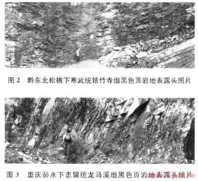 從地表頁巖出露情況分析認(rèn)為,筇竹寺組黑色頁巖(圖2)主要分布于川南的宜賓-瀘州、川東的達(dá)州-墊江-長壽一帶和黔北的金沙-江口-松桃一線以南地區(qū),渝東南的秀山、酉陽和湘鄂西的龍山、咸豐等地區(qū)也較為發(fā)育;五峰組-龍馬溪組筆石頁巖(圖3)主要發(fā)育于盆地邊部且相對穩(wěn)定,在川南的宜賓、瀘州、南川、綦江,川東的石柱、涪陵,渝東南的武隆-彭水-黔江,黔東北的道真-德江及鄂西的利川-咸豐-來鳳一帶發(fā)育完整,而在盆地腹部的樂山-龍女寺一線以西北,由于后期構(gòu)造抬升剝蝕而缺失。以上2套黑色頁巖熱演化程度普遍較高且已被證實為重慶及其周緣地區(qū)海相地層的主要氣源巖[16]。