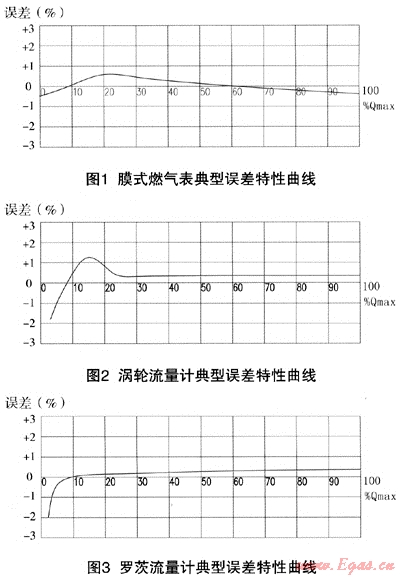 為確保燃氣計量的精確性和公平性,應根據(jù)燃氣公司的要求及用氣單位使用的具體隋況,確定流量計的精度。燃氣流量計的計量精度一般為1.0級和1.5級。常用流量計的典型誤差特性曲線如圖1、圖2、圖3。