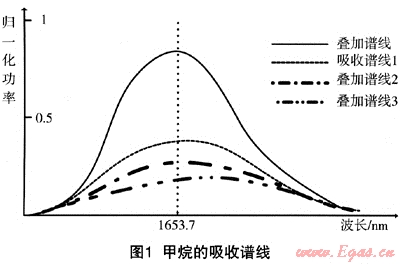 便攜式甲烷激光遙感探測(cè)儀是基于近紅外二極管激光吸收光譜的新型高靈敏度測(cè)量?jī)x器,選擇甲烷分子的強(qiáng)吸收譜線,不受其它氣體成分的干擾,甲烷在波數(shù)6046.96cm-1位置(波數(shù)等于1cm除以波長,即對(duì)應(yīng)波長1653.7nm)有3條吸收譜線,這3條譜線疊加在一起,形成了一個(gè)強(qiáng)吸收線,如圖1所示。
