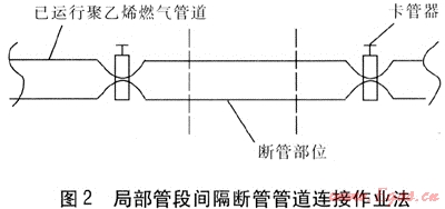 局部管段間隔斷管管道連接作業(yè)法見圖2。本作業(yè)適用于已運行聚乙烯燃?xì)夤艿琅c新建燃?xì)釶E管道的連接。在聚乙烯管道需連接部位左右適當(dāng)位置分別采用卡管器將已運行管道卡緊,選用隔爆手槍電鉆在需斷管部位打孔卸壓、斷管。將電熔套管安裝在斷管兩端口并與新建聚乙烯管進(jìn)行電熔焊接,待焊接完成后松開卡管器,管道連接作業(yè)完成。此作業(yè)方法優(yōu)點主要是操作方便,但存在的問題主要有: