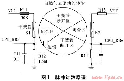 目前我國的IC卡燃?xì)獗砭捎妹}沖計數(shù)方式,即在原基表機(jī)械計數(shù)器上加裝脈沖傳感裝置如干簧管、霍爾元件等,產(chǎn)生脈沖輸出,電子控制器對采集到的脈沖進(jìn)行累計和換算,獲得數(shù)據(jù)。目前廣泛使用干簧管計數(shù),脈沖計數(shù)原理見圖1。