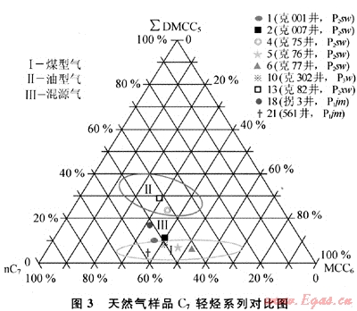 此外,利用C7輕烴系列化合物和烷烴碳同位素值[13~15]也可有效判別天然氣成因類型。如圖3所示,天然氣樣品明顯呈3個點群分布:Ⅰ類甲基環(huán)己烷(MCC6)含量相對較高,二甲基環(huán)戊烷(DMCC5)含量低(小于10%),為典型的煤型氣;Ⅱ類二甲基環(huán)戊烷的相對含量則有明顯增高(大于20%),屬油型氣;Ⅲ類C7輕烴系列的相對含量介于Ⅰ類和Ⅱ類之間,為油型氣和煤型氣的混源氣。
