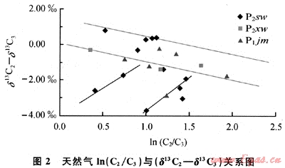 與干酪根初次裂解氣相比,原油二次裂解氣以C3的遞減速率高為特征。因此,利用(δ12C2-δ13C3)值與ln(C2/C3)值相關(guān)關(guān)系可有效區(qū)分干酪根初次裂解氣和原油二次裂解氣[11~12]。據(jù)此可判斷下烏爾禾組天然氣均為原油二次裂解成因氣,而佳木河組和上烏爾禾組天然氣成因類型相對多樣,既有干酪根初次裂解成因天然氣,也有原油二次裂解成因氣,同時也可能存在二者混合氣(圖2)。