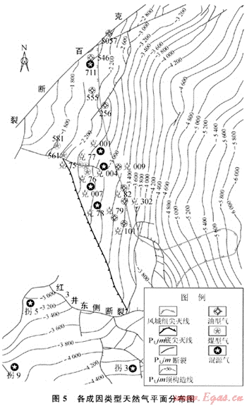 不同類型天然氣在平面上呈條帶狀分布(圖5)。油型氣主要沿風城組尖滅線分布,該處緊鄰風城組烴源巖,油型氣供給充足?;煸礆饩植加陲L城組尖滅線以外的區(qū)域,該區(qū)域為佳木河組烴源巖的主要分布區(qū),同時也是風城組烴源巖排烴的有利指向區(qū),易于煤型氣與油型氣發(fā)生混合。佳木河組內(nèi)部的煤型氣由于為自生自儲成因,分布相對廣泛;而上烏爾禾組煤型氣均集中分布在五區(qū)南斷裂附近,該斷裂為斷至佳木河組內(nèi)部的斷源斷裂,表明斷源斷裂是佳木河組烴源巖垂向排烴的優(yōu)勢通道。