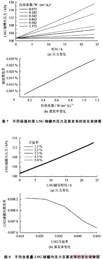 含氮量越高LNG的蒸發(fā)率越低,對(duì)LNG儲(chǔ)罐內(nèi)壓力影響不大,向LNG儲(chǔ)罐內(nèi)充注氮?dú)饪梢杂行У亟档凸迌?nèi)液體的蒸發(fā)率。