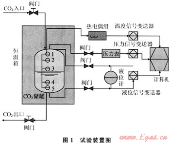 由于LNG的危險(xiǎn)性,直接進(jìn)行大容量LNG儲(chǔ)罐的試驗(yàn)非常困難,而模擬的理論基礎(chǔ)是氣液相平衡原理,對(duì)于各種尺度LNG儲(chǔ)罐都是適用的。因此本試驗(yàn)采用小型儲(chǔ)罐,用C02介質(zhì)代替LNG進(jìn)行低溫液體蒸發(fā)率試驗(yàn),測(cè)試該低溫液體儲(chǔ)罐靜態(tài)蒸發(fā)率,通過(guò)試驗(yàn)來(lái)驗(yàn)證模型的準(zhǔn)確性,然后用研制并完善的模型來(lái)研究大尺度的LNG儲(chǔ)罐內(nèi)的蒸發(fā)規(guī)律[12]。