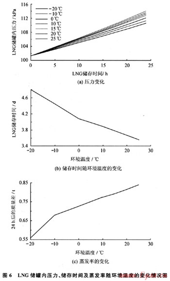 LNG儲(chǔ)罐內(nèi)壓力、儲(chǔ)存時(shí)間及蒸發(fā)率隨環(huán)境溫度的變化情況如圖6所示。