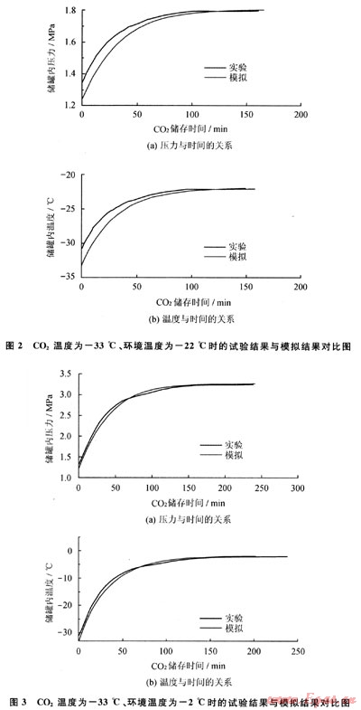 在相同初始充滿率下,測(cè)試不同環(huán)境溫度時(shí)儲(chǔ)存壓力及溫度的變化情況。試驗(yàn)采用不銹鋼小型儲(chǔ)罐,運(yùn)用自然升壓法測(cè)定儲(chǔ)罐內(nèi)介質(zhì)的蒸發(fā)量,利用恒溫槽改變介質(zhì)溫度及環(huán)境溫度,利用壓力傳感器得出儲(chǔ)槽內(nèi)壓力變化。試驗(yàn)裝置如圖1所示,C02溫度為-33℃,環(huán)境溫度為-22℃時(shí)的試驗(yàn)結(jié)果與模擬結(jié)果對(duì)比見(jiàn)圖2,CO2溫度為-33℃,環(huán)境溫度為-2℃時(shí)的試驗(yàn)結(jié)果與模擬結(jié)果對(duì)比見(jiàn)圖3。