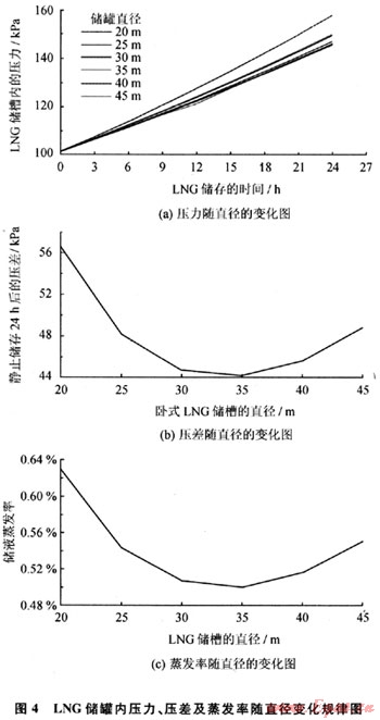 1) 其他條件不變時(shí),隨著儲(chǔ)存時(shí)間的增大,LNG儲(chǔ)罐的內(nèi)部壓力也隨之增大;隨著LNG儲(chǔ)罐直徑的增大,LNG儲(chǔ)罐的內(nèi)部壓力先減小,而后壓力增加,速率越來(lái)越快,這就必然存在一個(gè)最優(yōu)直徑使得艙內(nèi)壓力最小。