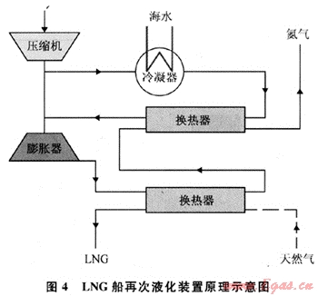 在LNG船上裝備可靠性較強(qiáng)的再次液化裝置,具有巨大的市場價(jià)值。再次液化裝置分為全部再次液化裝置、自持式再次液化裝置和部分再次液化裝置3類,其均處于可行性研究階段,并未實(shí)際投入生產(chǎn)使用。圖4為LNG船的再次液化裝置原理圖。
