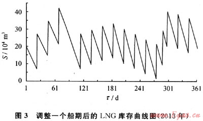 2) 應(yīng)用動態(tài)數(shù)學(xué)模型,通過LNG庫存曲線(圖3)可知所需罐容為41.87×104m,若選用常規(guī)l6×104m的儲罐,應(yīng)配置2.62個儲罐,取整為3個儲罐;若選用18×104m的儲罐,則應(yīng)配置2.33個,取整為3個儲罐。由此可見,采用靜態(tài)模型計算均勻來船情況下的LNG儲罐罐容尚且合理,而一旦來船期變化較大,靜態(tài)模型計算結(jié)果明顯不合理。而動態(tài)數(shù)學(xué)模型的計算結(jié)果更為合理。