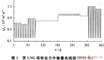 該LNG接收站項目LNG運輸船選擇21.5×104m3的主力船型,其2013年期的LNG接收站日外輸氣量(QS)曲線(同時也是匹配下游用氣市場的日用氣量曲線)如圖1所示。用戶類型包括管道外輸氣用戶(12.4%)、LNG槽車用戶(18.5%)及燃?xì)怆姀S用戶(69.1%)。