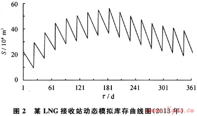 2) 應(yīng)用動態(tài)數(shù)學(xué)模型進(jìn)行計算的結(jié)果為:所需有效罐容為56.81×104m3,LNG庫存(S)曲線如圖2所示,若選用常規(guī)16×104m3的儲罐,應(yīng)配置3.55個儲罐,取整為4個儲罐;若選用18×104m3的儲罐,則應(yīng)配置3.16個,取整為4個儲罐。由此可見,該動態(tài)數(shù)學(xué)模型與原靜態(tài)估算模型的結(jié)論一致(原靜態(tài)模型的結(jié)果其實也是經(jīng)過設(shè)計單位內(nèi)部開發(fā)的動態(tài)仿真軟件校核過的)。