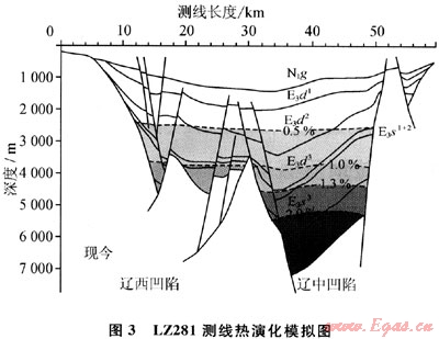 遼東灣地區(qū)有多個次級構(gòu)造帶,各凹陷烴源巖的演化程度有較大差異。為了進一步揭示和刻畫其演化差異,在單井模擬的基礎(chǔ)之上,結(jié)合以往研究成果,從該區(qū)選擇了10條二維剖面(圖1),應(yīng)用EASY%Ro模型進行埋藏史、熱史和成熟度演化史模擬。以測線LZ281剖面成熟度演化史模擬為例(圖3),模擬結(jié)果表明:整體來看,對于同一層位來說,與遼中凹陷相比,遼西凹陷的熱演化程度較低。遼東灣的生烴門限約為深度2500m(Ro>0.5%),遼中凹陷東二下段和遼西凹陷的東三段烴源巖進入生烴門限。遼東灣地區(qū)的排烴高峰(0.8%<Ro<1.0%)為深度3400~3600m,遼中凹陷東三段下部及沙一、二段烴源巖和遼西凹陷沙三段烴源巖處于排烴高峰階段,產(chǎn)生大量液態(tài)烴。深度超過4400m處,遼中凹陷大部分沙三段烴源巖進入高成熟階段(Ro>1.3%),以生成凝析氣、濕氣為主;沙四段烴源巖Ro>2.0%,進入過成熟階段。可見,現(xiàn)今遼西凹陷東三段-沙三段主力烴源巖主要處于生、排烴高峰,生成大量油氣,是目前遼西凹陷及其周圍地區(qū)內(nèi)一系列大中型油氣田發(fā)現(xiàn)的物質(zhì)基礎(chǔ);而遼中凹陷熱演化程度較高,除東下段和沙一二段烴源巖還處于生油階段,沙三段烴源巖主要處于生氣階段,是遼中凹陷和遼西低凸起發(fā)現(xiàn)大規(guī)模凝析氣田和油田的物質(zhì)基礎(chǔ)。