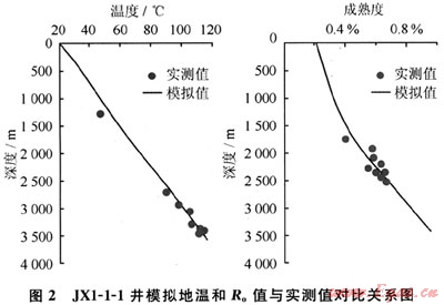 筆者對JX1-1-1、JZ25-1-3等10口井進行熱史模擬,并利用溫度和實測鏡質(zhì)體反射率進行標定。模擬的地溫隨深度的變化趨勢和鏡質(zhì)體反射率值,均與實測值的擬合關(guān)系較好(圖2),表明利用古熱流法恢復(fù)遼東灣地區(qū)的熱史是可行的。