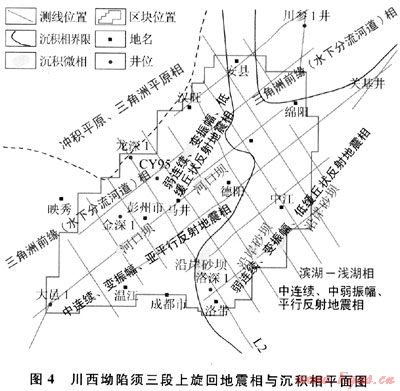 從研究區(qū)東南部的簡陽一帶往西北,地震剖面顯示厚度變大,波組連續(xù)性變好,表明由東南向西北水體變深,沉積環(huán)境由三角洲前緣向湖海相變化的特征。