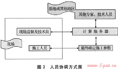 該方法不僅解決了數(shù)據(jù)計(jì)算速度問題,而且計(jì)算結(jié)果可以保存在服務(wù)器的數(shù)據(jù)庫中,可以由多個(gè)手機(jī)客戶端反復(fù)調(diào)用,便于多名工程技術(shù)人員在不同地區(qū)、環(huán)境下共同參與指導(dǎo)、監(jiān)督工作,使現(xiàn)場在遇到復(fù)雜情況時(shí)可以及時(shí)得到油氣田資深專家的意見,人員之間的協(xié)調(diào)方式如圖2所示。