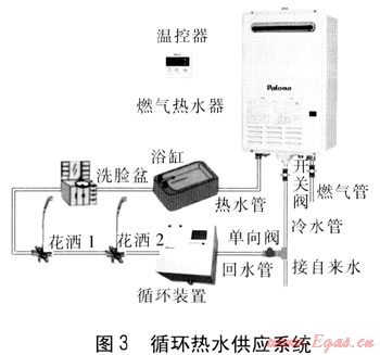 第二種方案:熱水器依然安裝于戶外陽臺,另為熱水器添置一套循環(huán)裝置(含小型水泵、水溫設(shè)定及感應(yīng)裝置、顯示屏等),組成一個家用中央循環(huán)熱水供應(yīng)系統(tǒng)(見圖3)。用戶在每次使用熱水之前,只要先開啟室內(nèi)任意一個熱水出水口的水龍頭,流水約1~2s再關(guān)閉,這樣就給了循環(huán)水泵一個啟動運(yùn)行的信號,循環(huán)水泵開始自動循環(huán)。熱水器的水流感應(yīng)器感應(yīng)到水流就會啟動燃燒。當(dāng)循環(huán)水泵機(jī)盒感應(yīng)器感應(yīng)到循環(huán)管路中水溫上升到預(yù)先設(shè)定的溫度,如40℃時,循環(huán)水泵就會自動停止工作。然后,要使用熱水時一開水龍頭即時就有設(shè)定水溫的熱水出來了。相應(yīng)冷熱水循環(huán)管道需于樓宇建造期間預(yù)先暗埋敷設(shè),而熱水管最好能適當(dāng)絕熱。