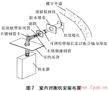 然而,對衡機(jī)有關(guān)煙管的安裝位置需于樓宇建造期間預(yù)先留好孔洞,且保證煙管長度盡可能短,煙管的彎頭數(shù)量盡可能少(而強(qiáng)制排煙式熱水器的煙管最大長度、彎頭最大數(shù)目等,應(yīng)遵照制造商的指引)。室內(nèi)對衡機(jī)安裝布置見圖2。