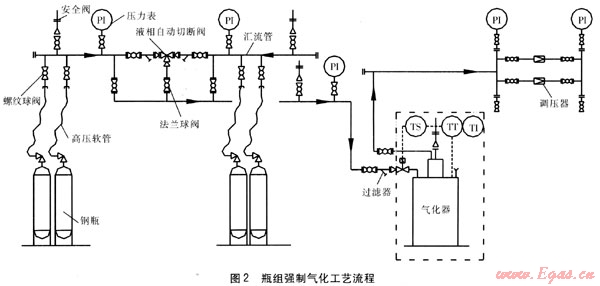 儲罐強制氣化工藝系統(tǒng)由儲罐、氣化裝置、調(diào)壓裝置、壓縮機、工藝管路系統(tǒng)、閥門、壓力表、液位計等構(gòu)成。該系統(tǒng)的特點:a.供氣質(zhì)量與瓶組強制氣化工藝系統(tǒng)相同;b.能根據(jù)企業(yè)用氣情況,設(shè)置適合的儲氣規(guī)模,能實現(xiàn)比瓶組強制氣化工藝系統(tǒng)大得多的供氣規(guī)模,滿足工業(yè)企業(yè)大量用氣的需要;c.儲罐站占用面積大,站址選擇要求多,造價高,建設(shè)周期長。